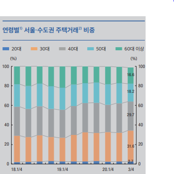 청년층의 경우 주택 매입 시 금융기관 차입을 통한 자금조달 비중이 여타 연령층에 비해 높은 수준을 유지 하였습니다.